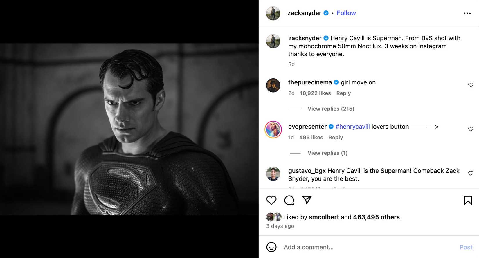 Snyder compartilhou uma imagem de Cavill com a legenda “Henry Cavill é Superman”, em celebração ao seu aniversário de Instagram. A postagem gerou comentários divididos entre aqueles que apoiam Corenswet como o novo Clark Kent e aqueles que desejam o retorno de Cavill e Snyder para continuar sua visão do herói. Contudo, a recepção geral indica uma preferência pela nova direção criativa.